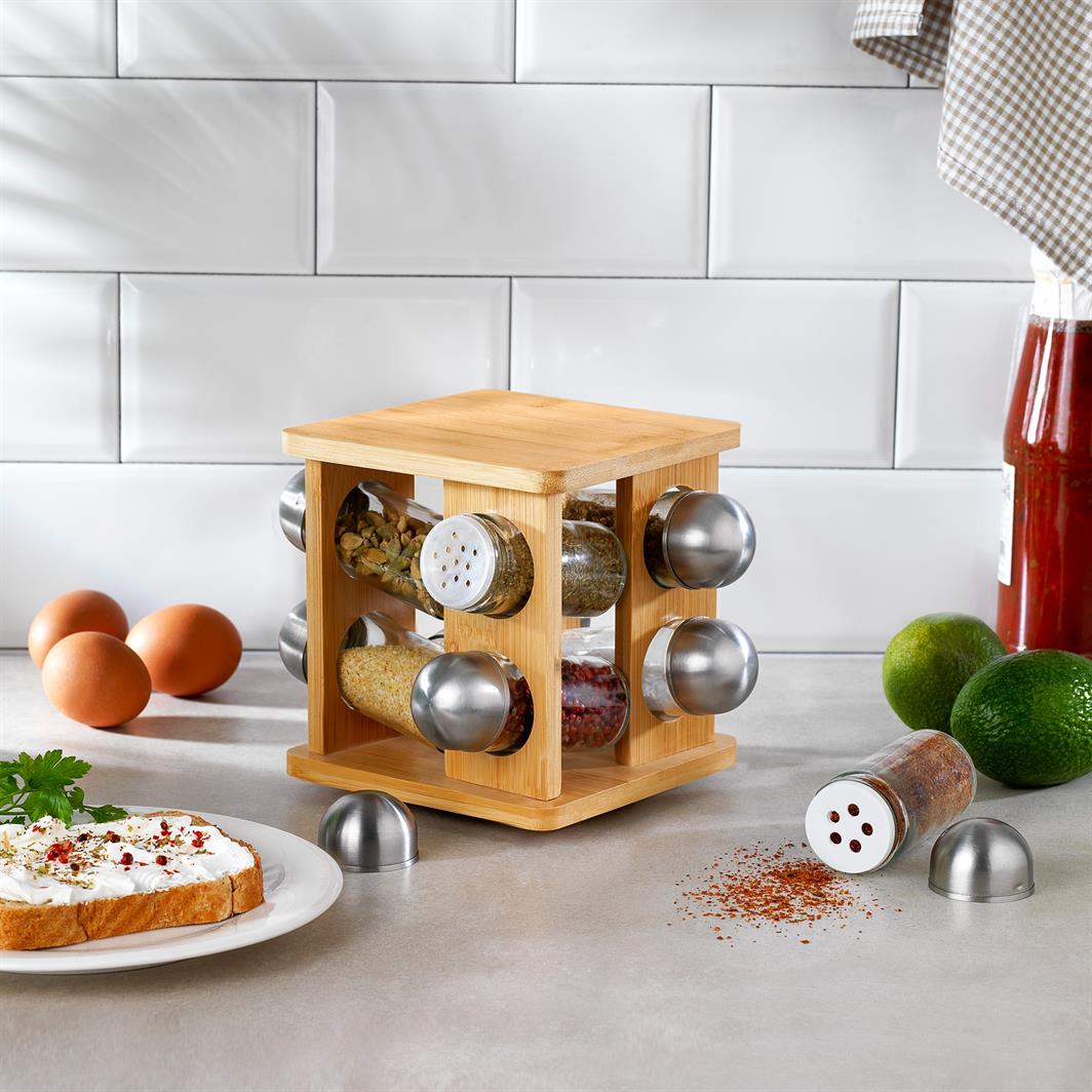 - Fonti 8'Lİ Dönen Baharatlık, 360 derece dönebilen mekanizması, bambu gövdesi ve 8 adet cam şişesi ile mutfağınızın vazgeçilmezi olacak.